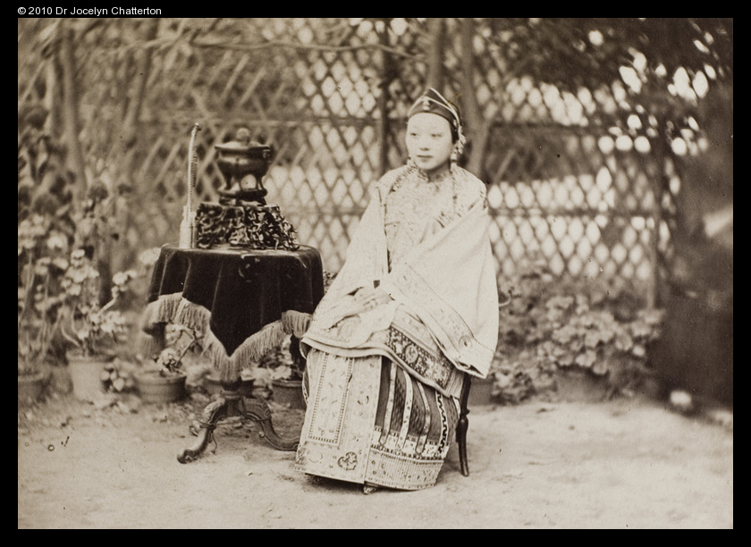 “The wife of a wealthy tea merchant seated in a garden, 1865. Photographer: unidentified. Albumen print. Origin: Tien Tsin.”