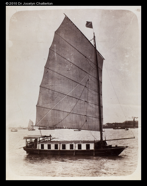 A foreigner’s hybrid houseboat, with large lug sail, on the Whangpoo, 1880-1890.
