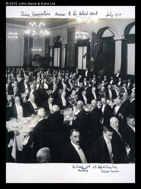 Annotations in the hand of G. Warren Swire, identifying the occasion, as well as Sir Robert Hart, and on his left J.H. Scott (John Swire & Sons, and President of the China Association), and also, on his left, sitting, the Chinese Minister to the United Kingdom, Li Ching Fong (Li Jingfang 李經方; 1855?-1934).