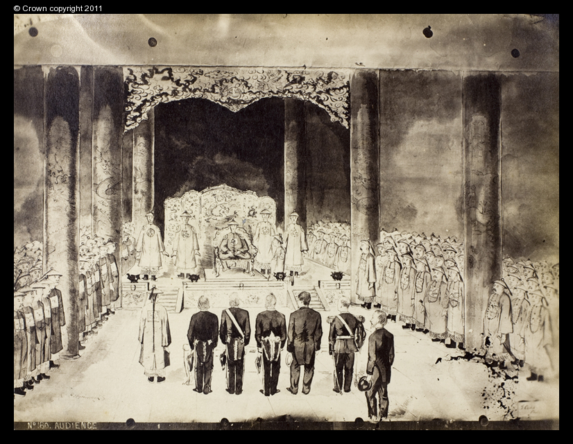 Audience with the Tongzhi Emperor (1856-1875) in Tse Kuang Ko (Pavilion of Violet Light or Purple Pavilion), Peking (Beijing) on 29th June 1873.
