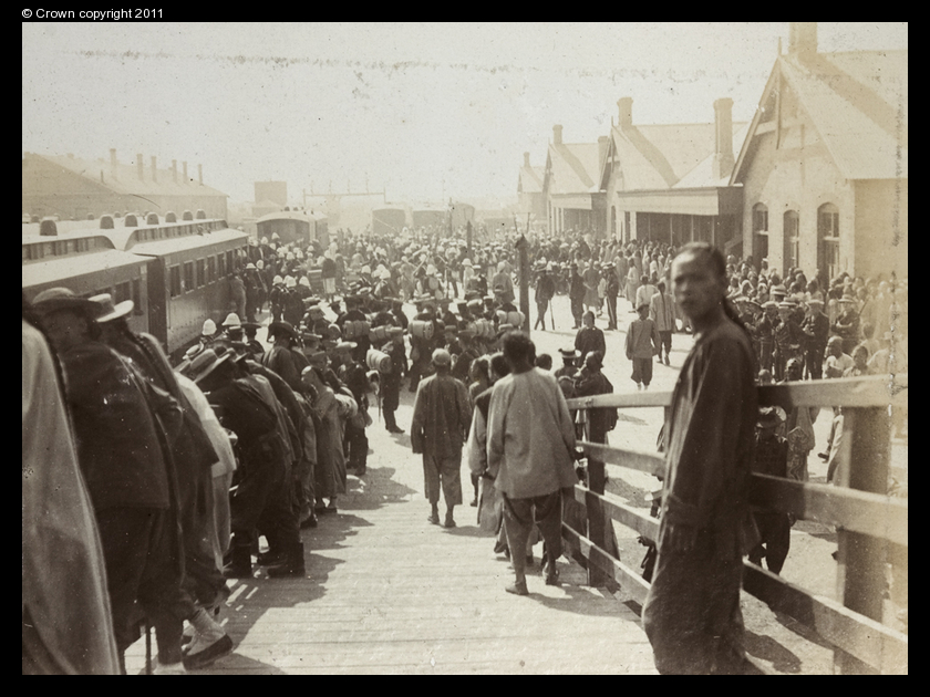 Chinese onlookers, trains, and allied troops, at Tientsin railway station