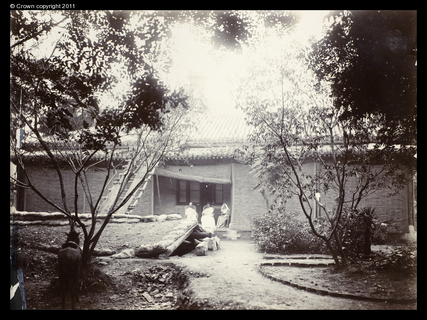 "In the British Legation. Secretary Cockburn’s House, with a ‘Bomb-proof,’ three or four feet deep, in front of it. The earth in the yard was dug up and used to fill sand bags. There was a sentry post on the roof. The inclined way was prepared for the purpose of taking a rapid-fire gun up on to the roof."