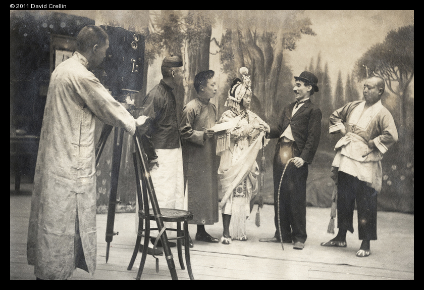 In this photograph, Tommy Crellin is playing the part of Charlie Chaplin, while being filmed in a studio with opera actors.