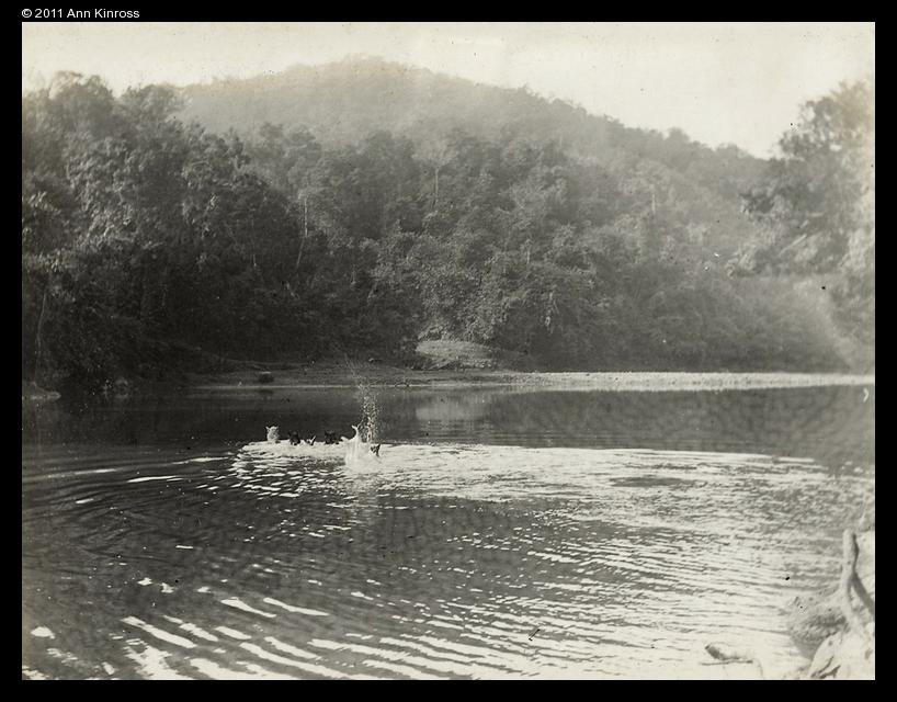 Caption on support : Caravan of mules and ponies swimming a river, Shan states