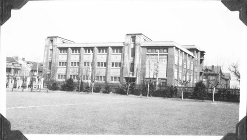 Information data : A playing field (foreground) and a four-storeyed building in modern style, maybe a school (background).