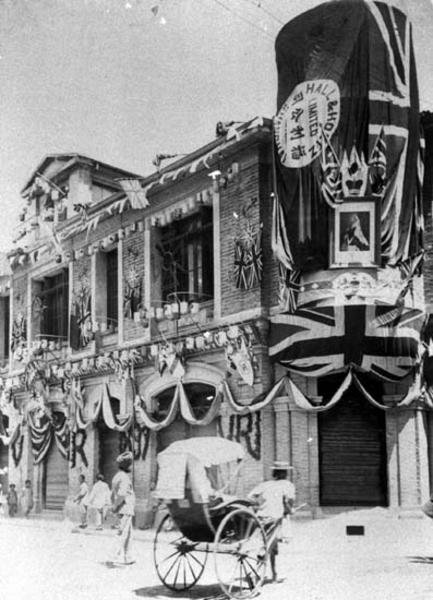 Information data : A three-storeyed building wade of bricks and decorated with every sort of English flags and Queen Victoria's portrait on the door.