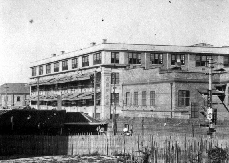 Information data : Side view of the printing works of the Commercial Press (Shangwu yinshuguan 商務印書館) in a five-storeyed building in Chinese modern_style. On its left some small buildings and a bus-stop.