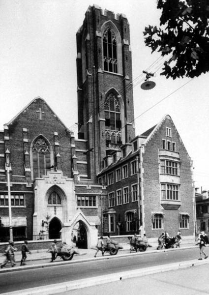 Information data : The protestant complex was founded as Moore's wife memorial, and it assembled the American, English and German churches previously established (all during the second half of XIXth c.) and joining the 'Mc Tyeire School' (Modi xuejiao), that was a female college established in 1892. The complex (built in 1929-1931) was made of a residence ( foreground right), the church (left) and its bell tower (right).