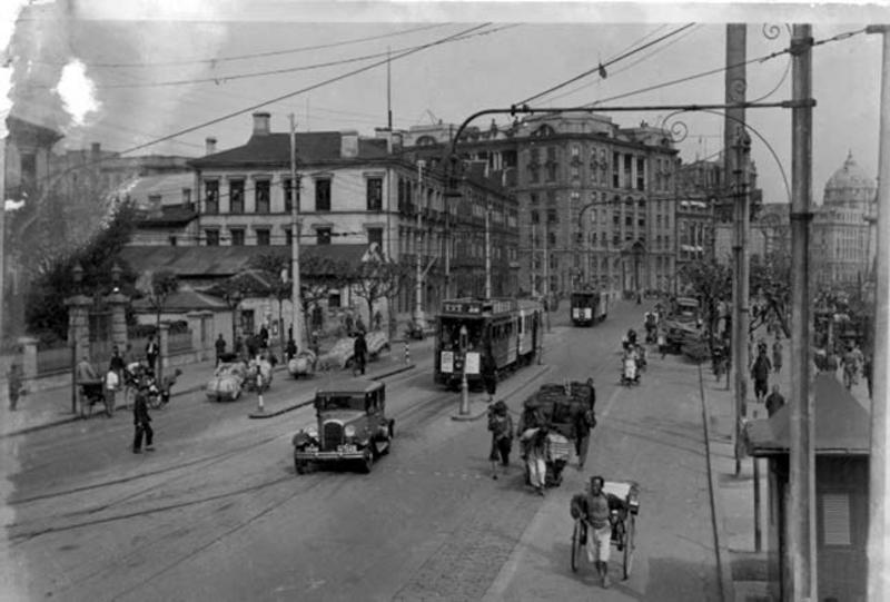 Keywords : traffic;tramway;car;handcart;rickshaw;building;