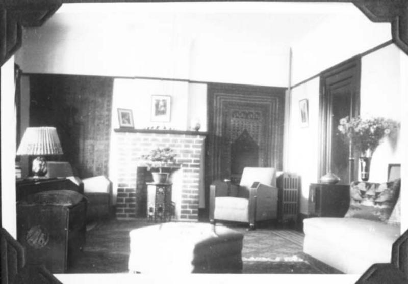 Information data : Living room: art deco furniture (armchairs and sofa) and Chinese-style objects (lamps, vases, etc.) inside a brighty room with fireplace.