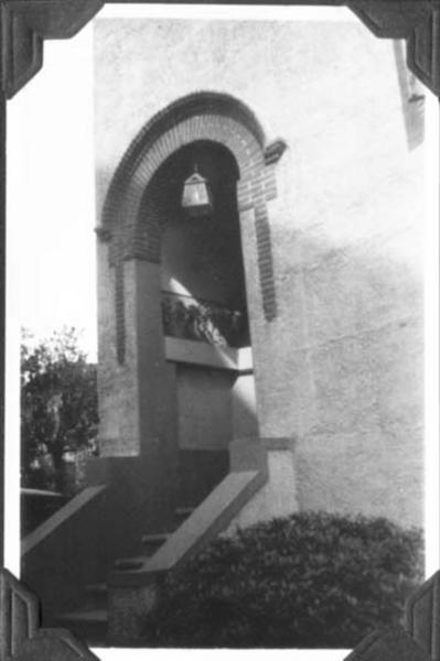 Information data : The main entrance of a detatched house: a small stairs and a little arch decorated by breaks.