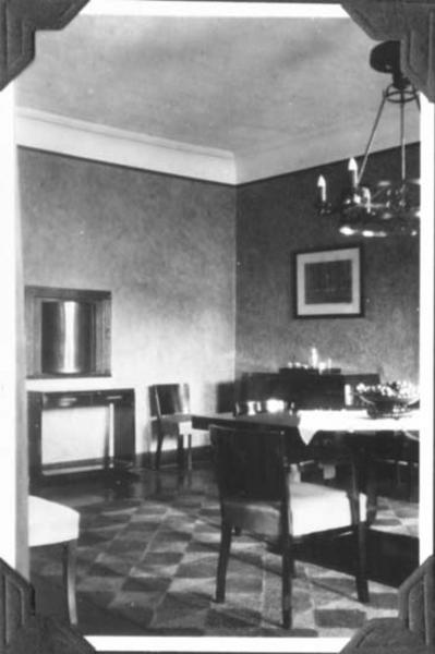 Information data : Dining room: a tabl and some chairs, a sideboard (background) in European style.
