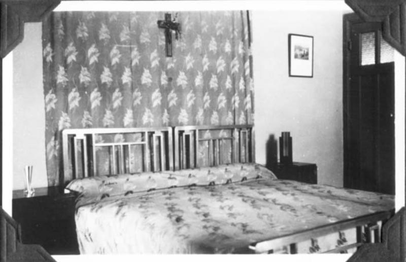 Information data : Bedroom in European style: a marriage bed with nightsides and a crucifix on the wall.