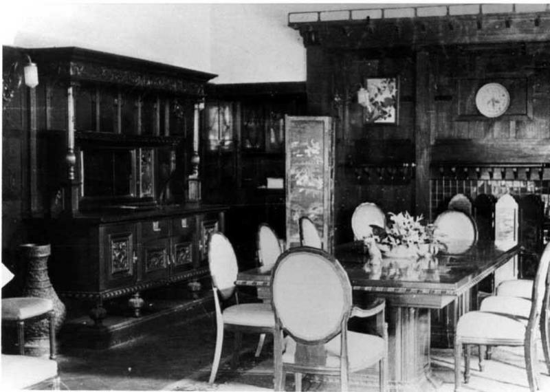 Information data : Dining room: table with marble-top and chairs in the middle of the room, on the wall a fire place surrounded by a wooden structure, moreover a Tudor-style sideboard, a Chinese vase and art nouveau lamps.
