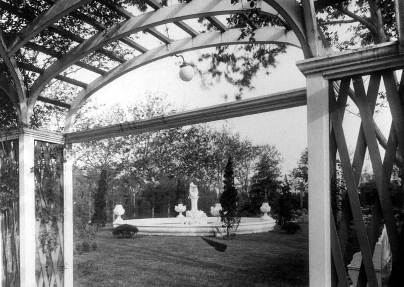 Information data : A fontain with its central statue in a private garden taken from a pergola.