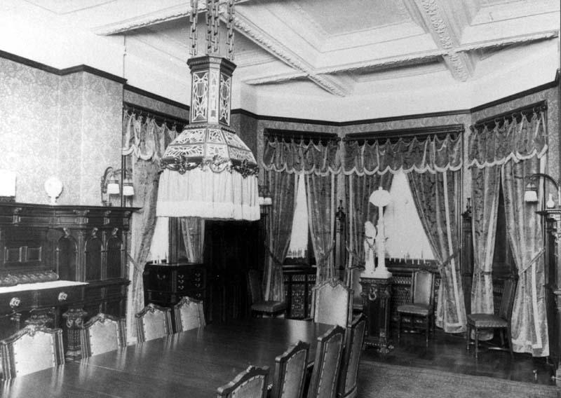 Information data : Dining room: furniture and decorative elments in Victorian style, lamps in art nouveau and stuccowork on the ceiling.