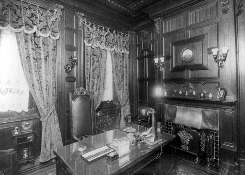 Information data : Office interior: furniture in Victorian style, lamps in art nouveau, fireplace and wooden covered walls.