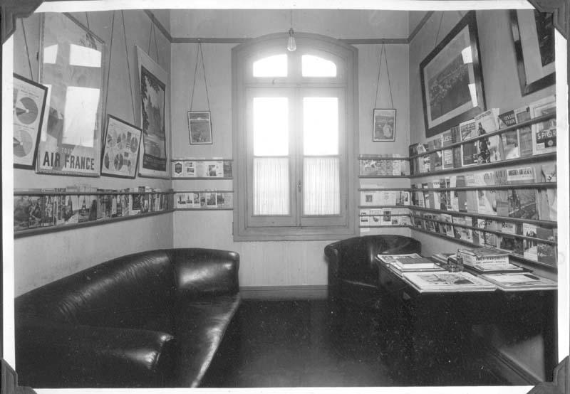 Information data : Reading room: leather sofa and armchair; magazines on the tables, photos, journals on supports, posters and pictures on the walls.'
