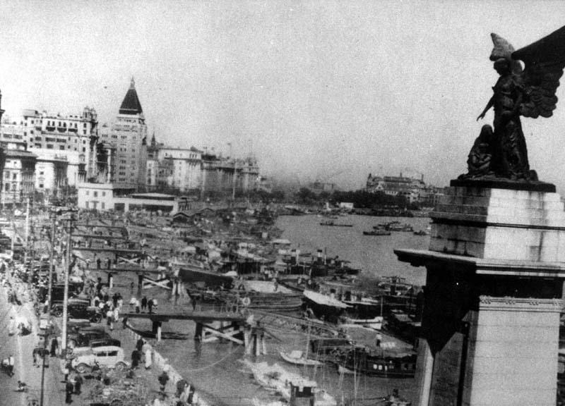Information data : On the right, one can see the Cenotaph, a World War I Memorial. The pointed roof in the back left is the Cathay Hotel (now renamed Peace Hotel). The Concordia Club has not been demolished yet and the Broadway Mansion (actually Shanghai Mansion) is under construction.