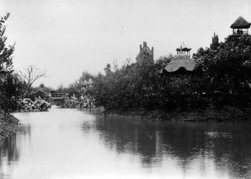 Information data : A view on the lake and pavilions of a Chinese style park.