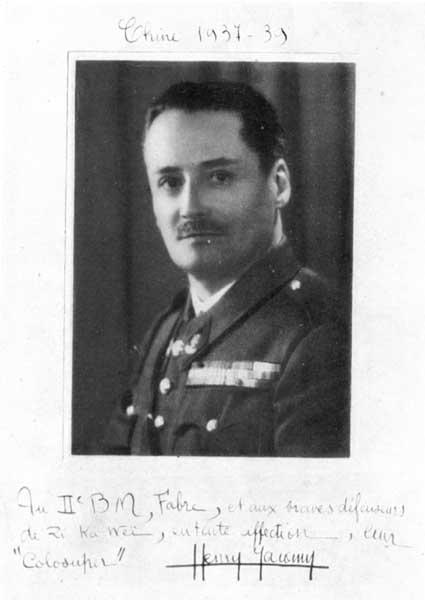 Caption on print : Chine 1937-39 'Au IIe BM, Fabre, et aux braves défenseurs de Zi Ka Wei, en toute affection, leur 'colosuper' ' 'Henry Jacomy'