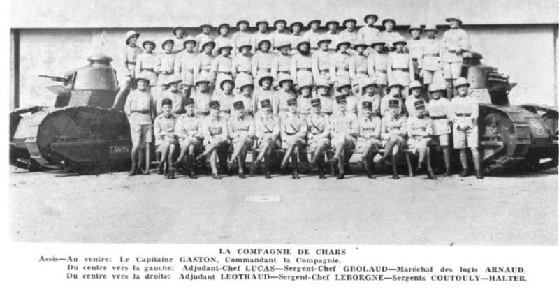 Caption on print : La Compagnie de Chars Assis au centre : Le Capitaine Gaston, Commandant la Compagnie. Du centre vers la gauche : Adjudant-Chef Lucas - Sergent-Chef Grolaud - Maréchal des logis Arnaud. Du centre vers la droite : Adjudant Leothaud - Sergent-Chef Leborgne -