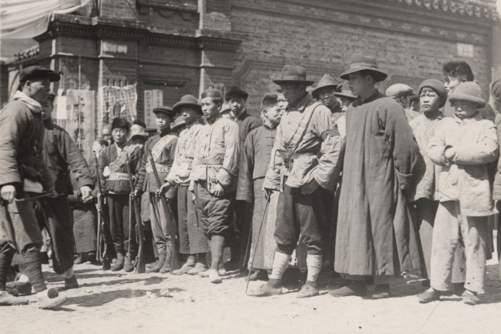 Caption on support : Shanghai. Enrollement des guerrillas Chinois dit "Robes Noires" à leur point de concentration à Chapei.