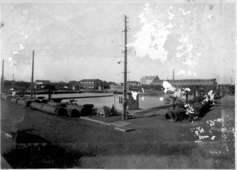 Information data : Large water pipes near an artificial pool with industrial buildings in the background