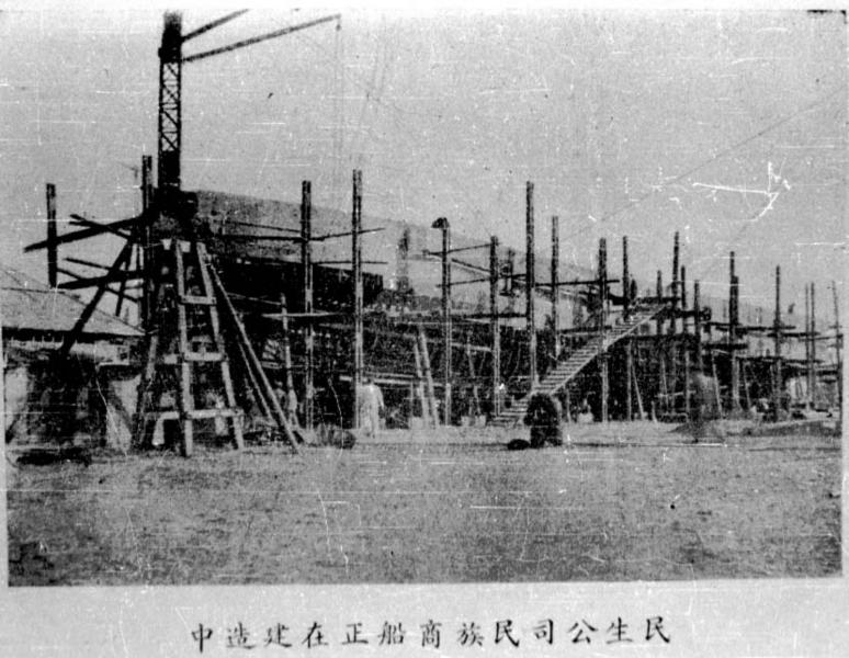 Caption on support : Minsheng gongsi minzu shangchuan zhengzai jianzao zhong (The 'Minzu' merchant ship of the Minsheng Company under construction) '