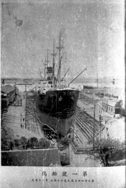 Caption on support : Di yi hao chuanwu (Drydock number 1) chang wubai sishi wu ying chi, kuan liushi ying chi, shen ershi ying chi (length 540 feet, width 60 feet, depth 20 feet)