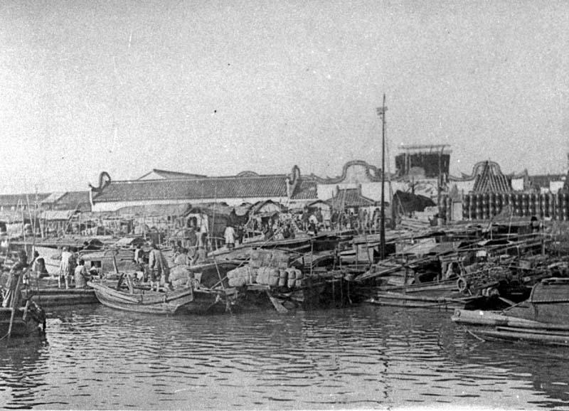A riverbank crowded with sampans