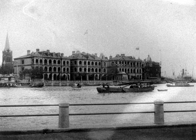 The German Consulate-General on the Hongkew Bund opened in 1886 and was pulled down in 1937. The German chapel at left was completed in 1903.
