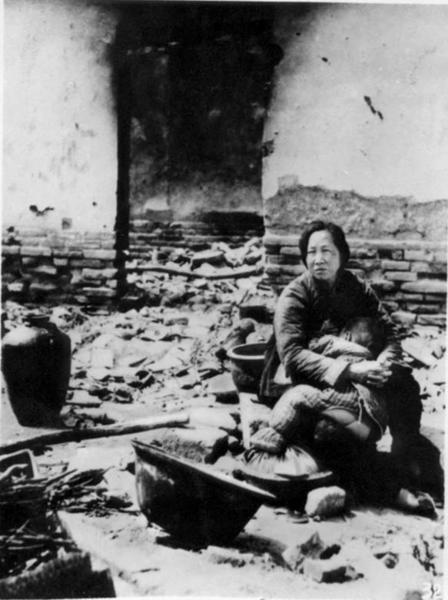Woman and child among ruins