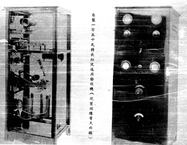 Caption on support : zizhi yibaiwushi wate changduan bo tongyong fabaoji (xian zhi Shunsheng Qingtian liang jian) Self-made (made in China) 150 watt wave lenght universal radio transmitter ( installed in two warship