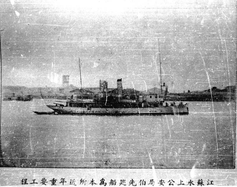Caption on support : Jiangsu shuishang gong'anju boxian xun pan wei ben suo jinnian zhongyao gongcheng (The Jiangsu Public Security Bureau coastguard vessel Boxian used for important projects in recent years)