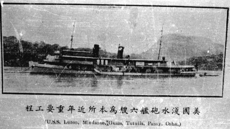 Caption on support : Meiguo qianshui baopan liu suo wei ben suo jinnian zhongyao gongcheng (One of the six American gunboats for shallow water used for important project in recent years) (U.S.S. Luzon, Mindanao, Guam, Tutuila, Panay, Oahu.)