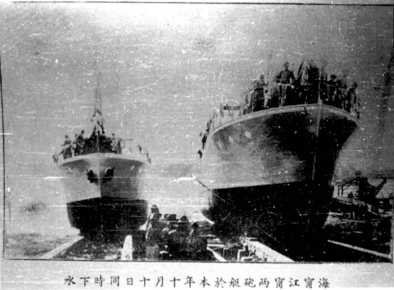 Caption on support : Haining Jiangning liang paoting yu ben nian shi yue shi ri tongshi xiashui (The two gunboats Haining and Jiangning lauched the same day this year on the 10th October)