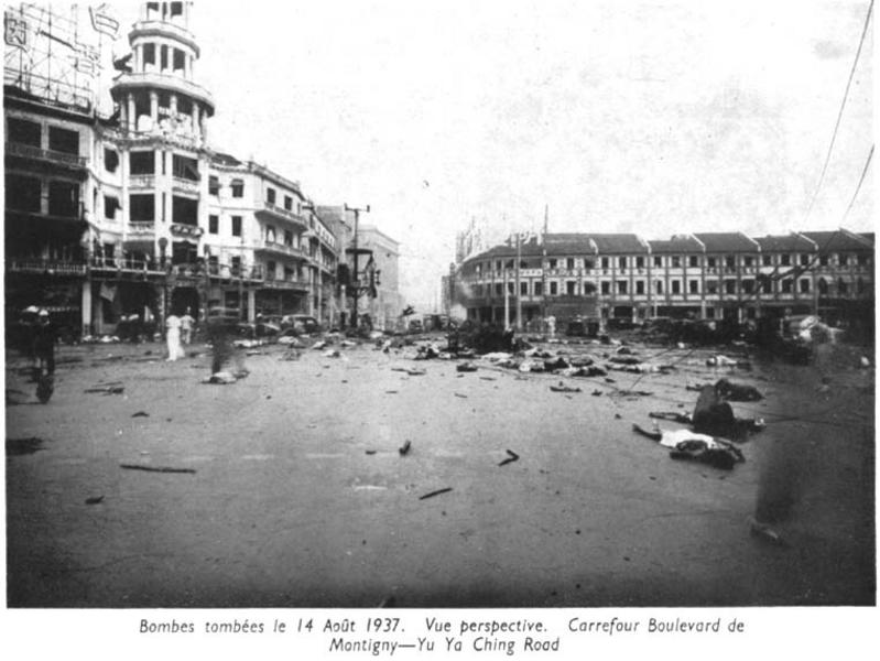 Caption on support : Bombes tombées le 14 Août 1937. Vue perspective. Carrefour Boulevard de Montigny -- Yu Ya Ching Road (Bombs fell on 14th August 1937 on the crossroad of Boulevard de Montigny and Yu Ya Ching Road.)
