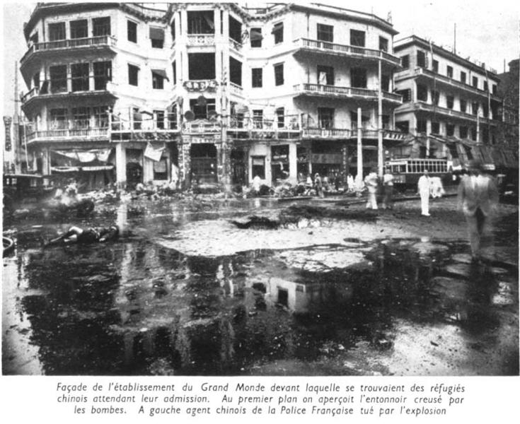 Caption on support : Façade de l'établissement du Grand Monde devant laquelle se trouvaient des réfugiés chinois attendant leur admission. Au premier plan on aperçoit l'entonnoir creusé par les bombes. A gauche agent chinois de la Police française tué par l'explosion.