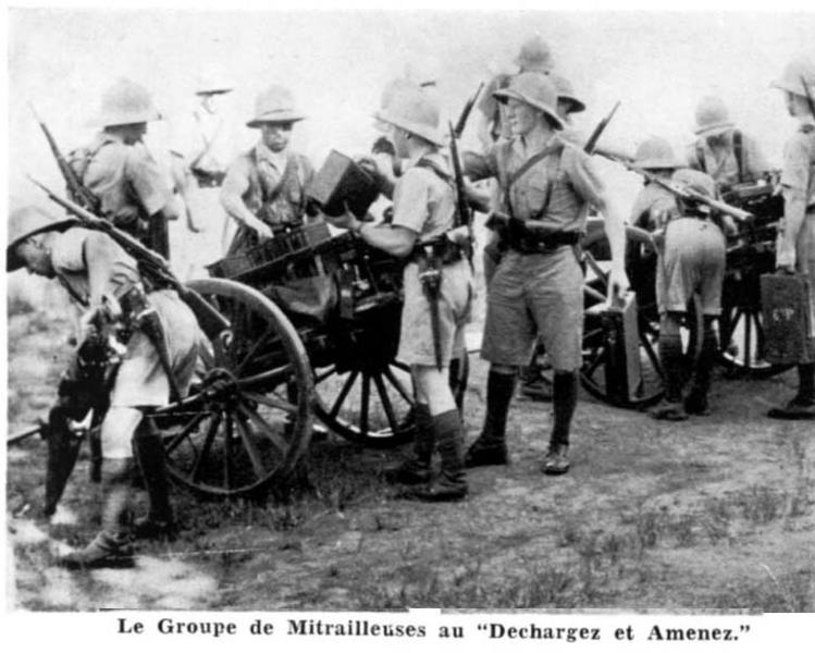 Caption on support : Le Group de Mitrailleuses au 'Dechargez et Amenez.' (The machine gun group 'unloading and bringing')'