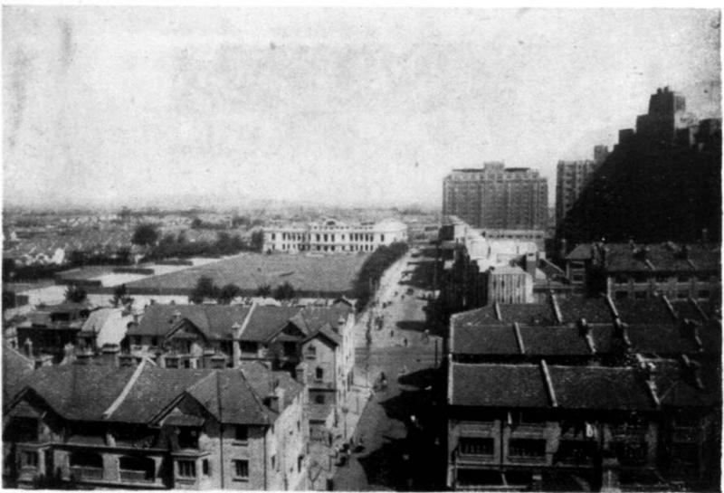 Information data : Picture taken from rue Cardinal Mercier. Note the Cercle Sportif Français and its large garden. To the right, in the back the Cathay Mansions, then Grosvernor Mansions. To the right, the Cathay Theater.