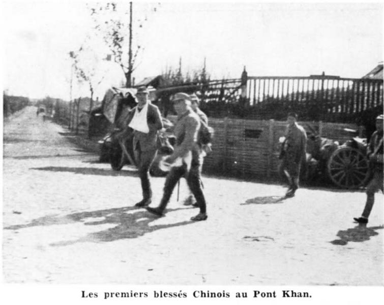 Caption on support : Les premiers blessés Chinois au Pont Khan. (First Chinese wounded soldiers at the Khan bridge.)