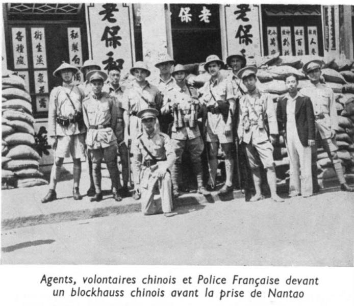 Caption on support : Agents, volontaires chinois et Police Française devant un blockhaus chinois avant la prise de Nantao. (Policemen, Chinese volunteers and the French Police in front of a Chinese blockhouse before the capture of Nantao)