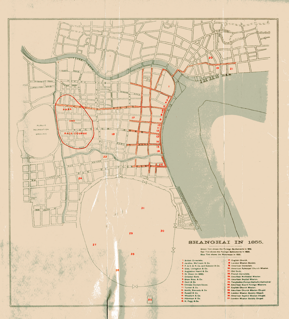 Comments : This is an intersting map that shows Shanghai English settlement as of 1855 on a map that was clearly produced at a later date.It was published in "A Short History of Shanghai" by H. Pott (see bibliography). It carries a list of buildings with their name and location.The map also shows the location of the second racecourse in the city. Pott, F. L. Hawks (Francis Lister Hawks), 1864-1947, A short history of Shanghai, being an account of the growth and development of the international settlement (1928)