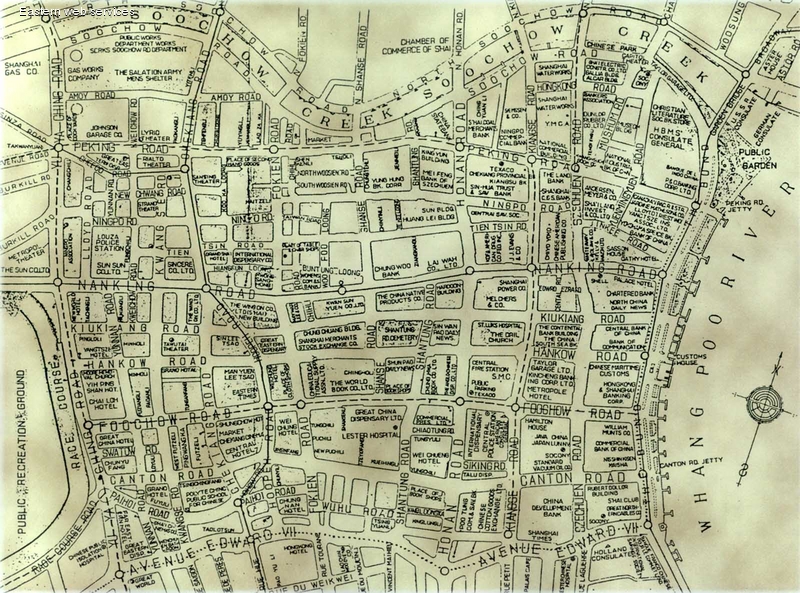 Comments : This undated map of the central district of the Shanghai International Settlement shows a detailed view of the street, solely with English names, and of various buildings, companies, etc. Locations are approximate.
