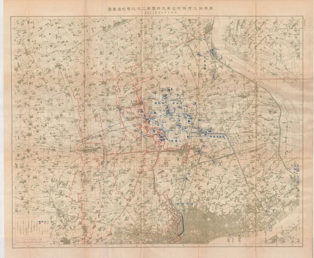 Caption on back: 第十六卷附圖第十九廟巷鎮, 江灣鎮第九師團第二次攻擊經過要圖 昭和七年二月自二十三日至二十五日
