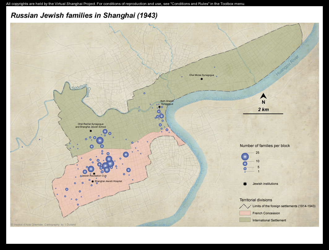 Comments : This map is based on a survey of Russian Jewish families in 1943. The original document is located in the archives at NARA [RG263 SMP U239 1943], although we used the copy available at the Hoover Archives in the collections of the Sino-Judaic Institute. The document is cryptically entitled "List of Jewish families to be visited". Except for three names, however, the list includes only Russian names.