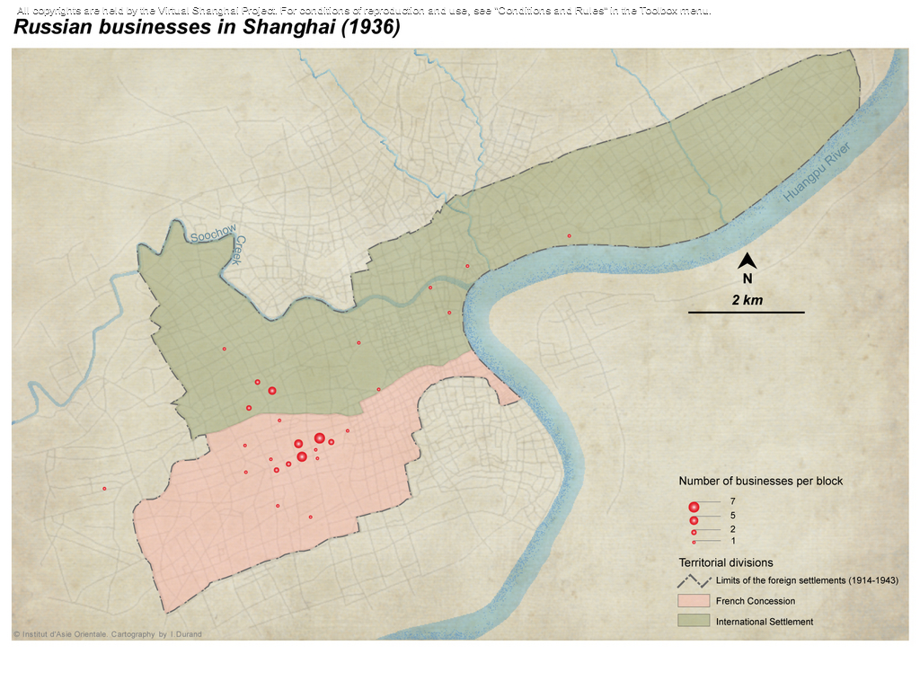 Comments : This map is based on a listing of Russian businesses in a Shanghai in a fascinating and rare book [Jiganoff, V. D., Russians in Shanghai (1936)] published in 1936 with the explicit purpose to promote and praise the Russian presence in the city. It was the product of an individual undertaking. Although it claims to be fairly exhaustive, we just do not know how the author worked and how he selected the businesses included in his book. Yet there is little doubt that this represents a solid sample (see also the collection of photographs published in the same volume). This unique volume is part of the Rena Krasno collection at the Hoover Archives.
