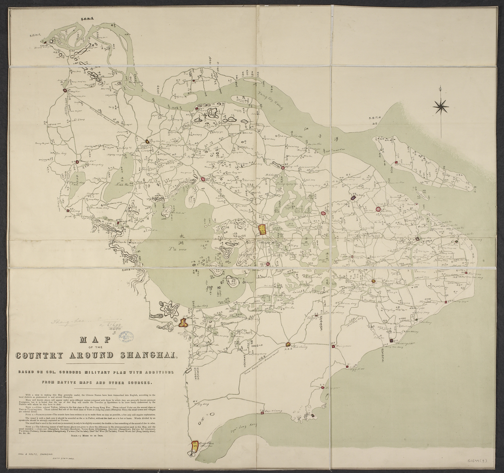 Rough map of the entire area west to the Taihu Lake and East to all of Pudong. Major place. Names in Chinese and transliteration. Provides a sense of the topographical knowledge of the area by British military.