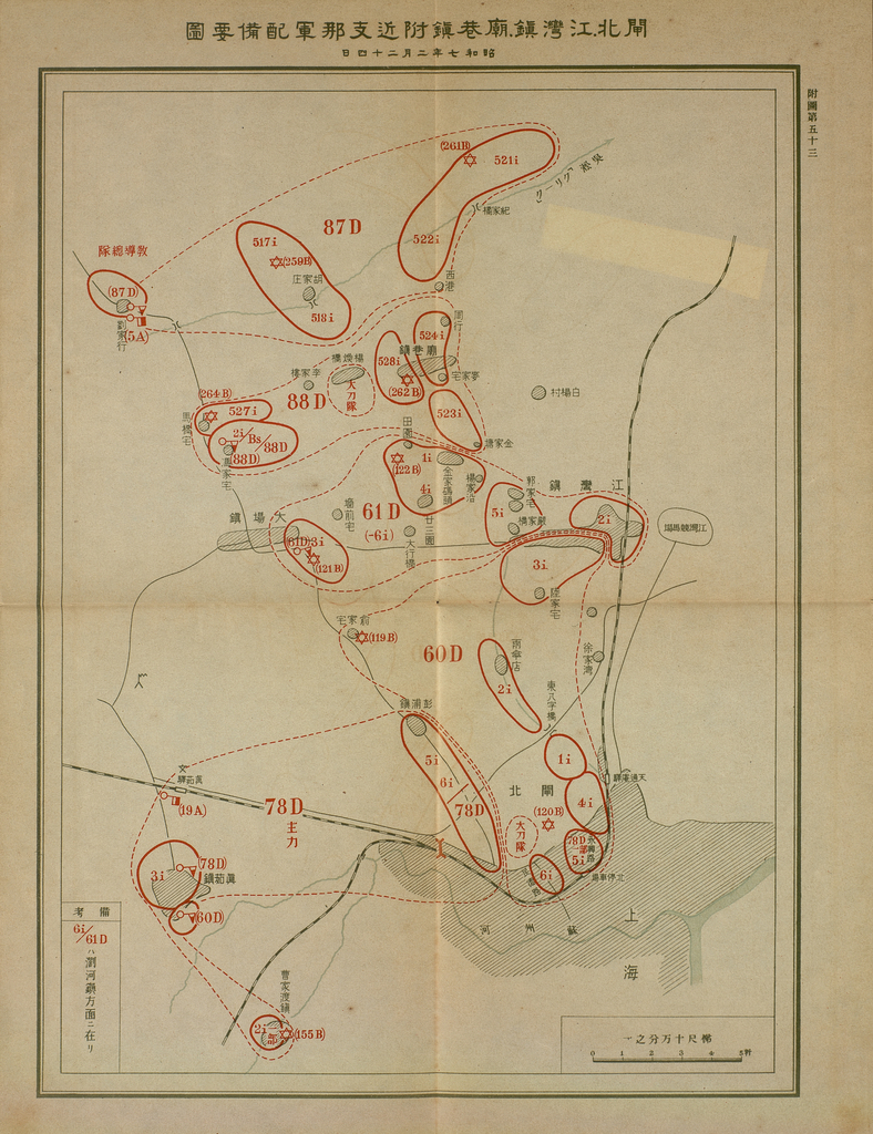 Caption on back: 第十六卷附圖第五十三閘北江灣鎮廟巷鎮附近支那軍配備要圖 昭和七年二月二十四日